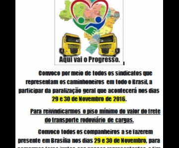 Aos que não estiverem em Brasília na data marcada, o pedido é que estejam aderindo o protesto por meio de uma paralisação nas rodovias, atingindo assim, toda malha rodoviária do país. Os caminhoneiros que se manifestarem desta forma devem obedecer aos horários: das 07h às 11h e das 13h às 17h.